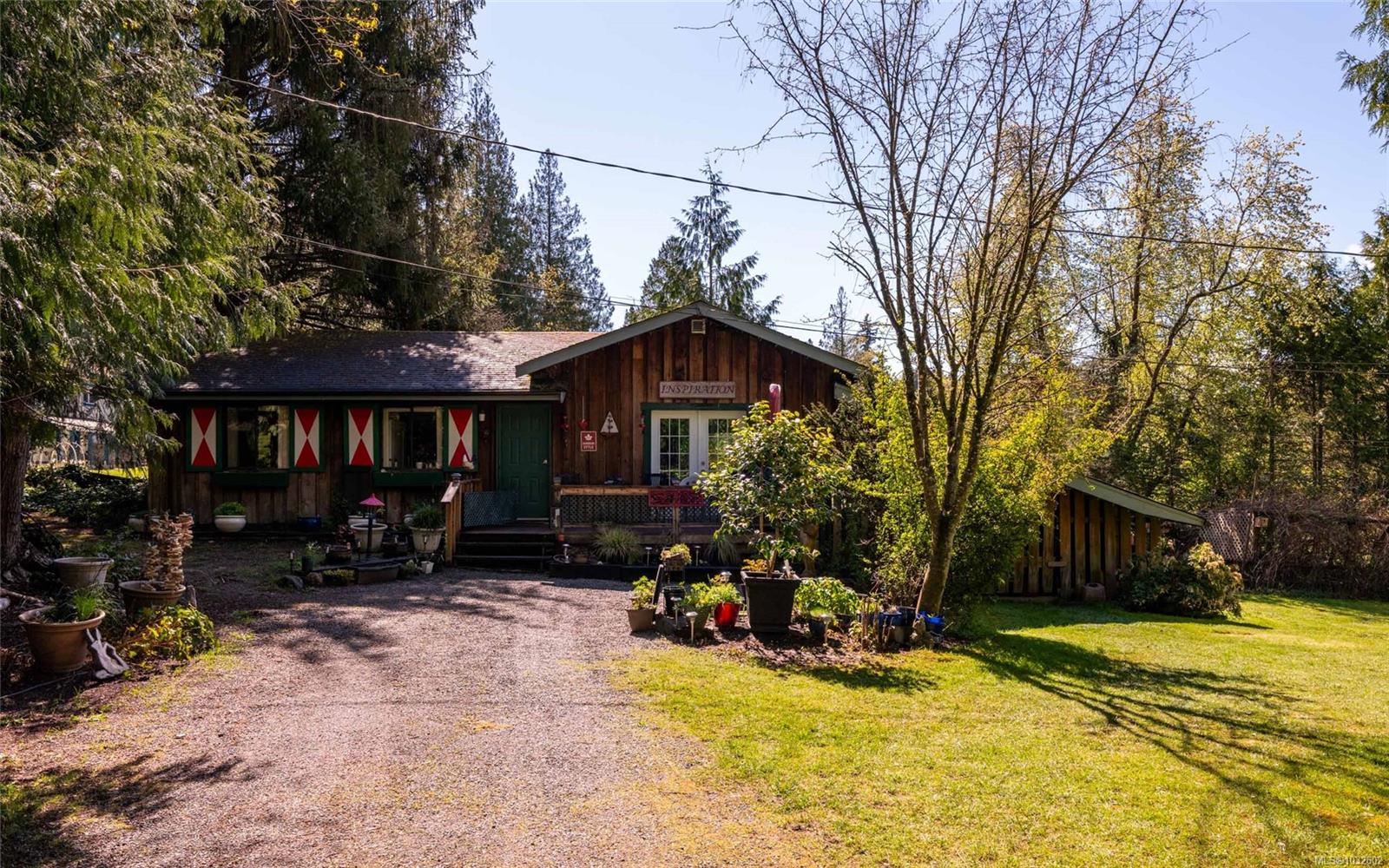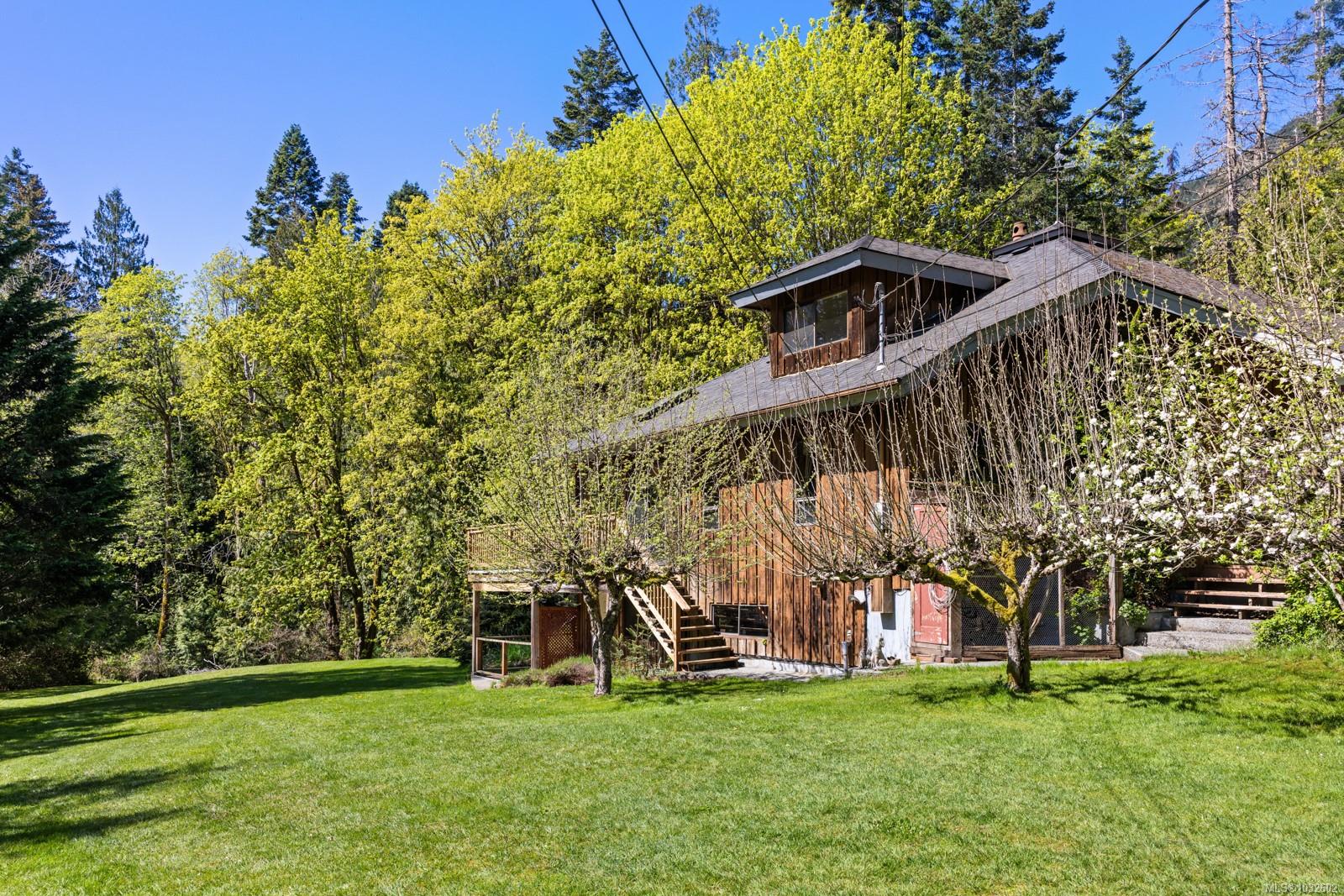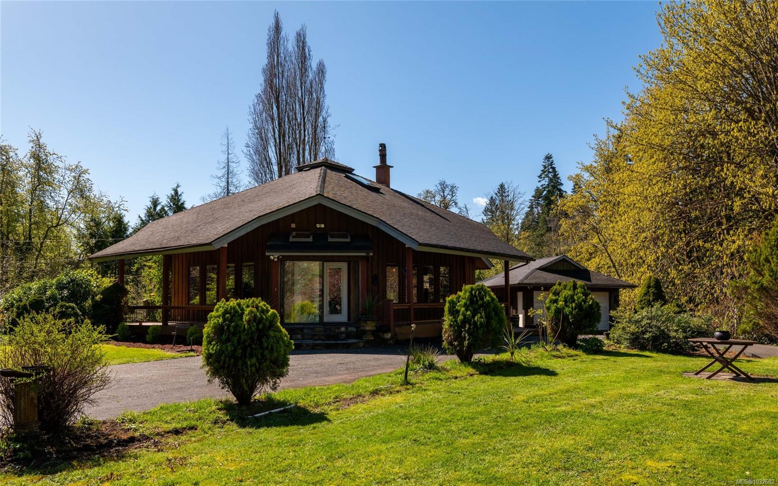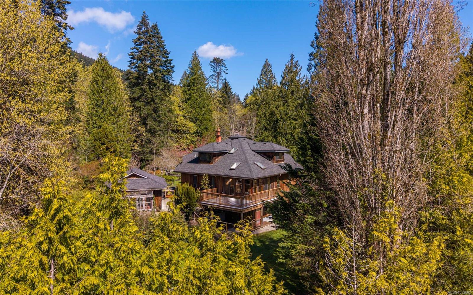 This rare, one-of-a-kind 4.8-acre property with a main home, detached 2 bed in-law cottage & a double garage is pure magic. Mature trees, established plantings & a salmon spawning creek with charming bridges set a whimsical stage against Mt Prevost. Peacefully private, yet minutes from town, this sun-drenched escape offers endless possibility. Inside the main home, find 2 main-floor bedrooms both with ensuites, a living room with a cozy wood stove, spacious dining area, inviting sunroom & an updated kitchen. Upstairs, the 1000sqft primary suite awaits with endless potential to create your sanctuary or reimagine the layout. Downstairs you will find the laundry, 3pc bath & unfinished space offering future opportunity or workshop/storage. The 2-bed, 2-bath cottage is perfect for guests or family & the attached lean-to is perfect for all your toys. This is a lifestyle canvas. Bask in the sun, create memories, & enjoy semi-rural tranquility with town at your fingertips. New water system.