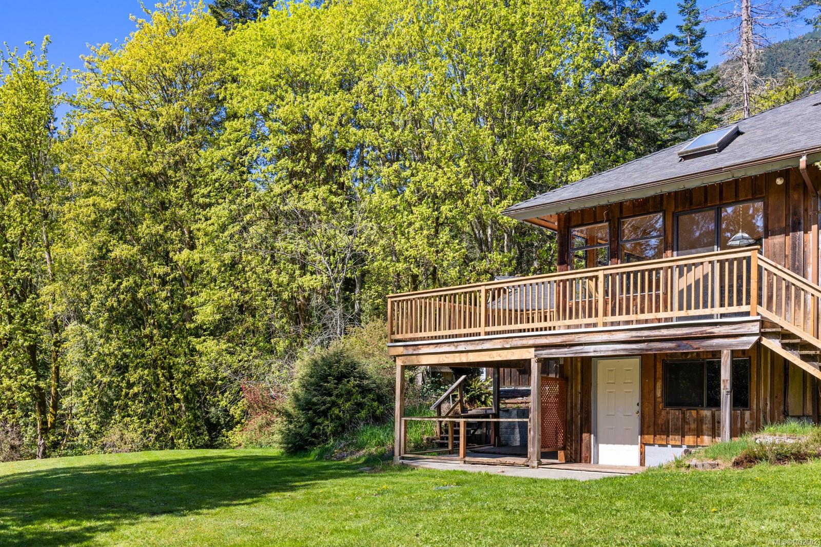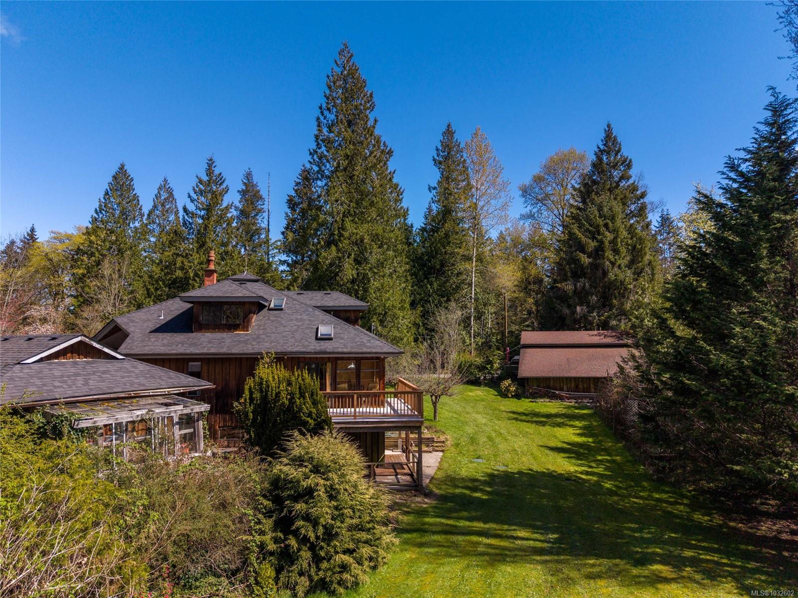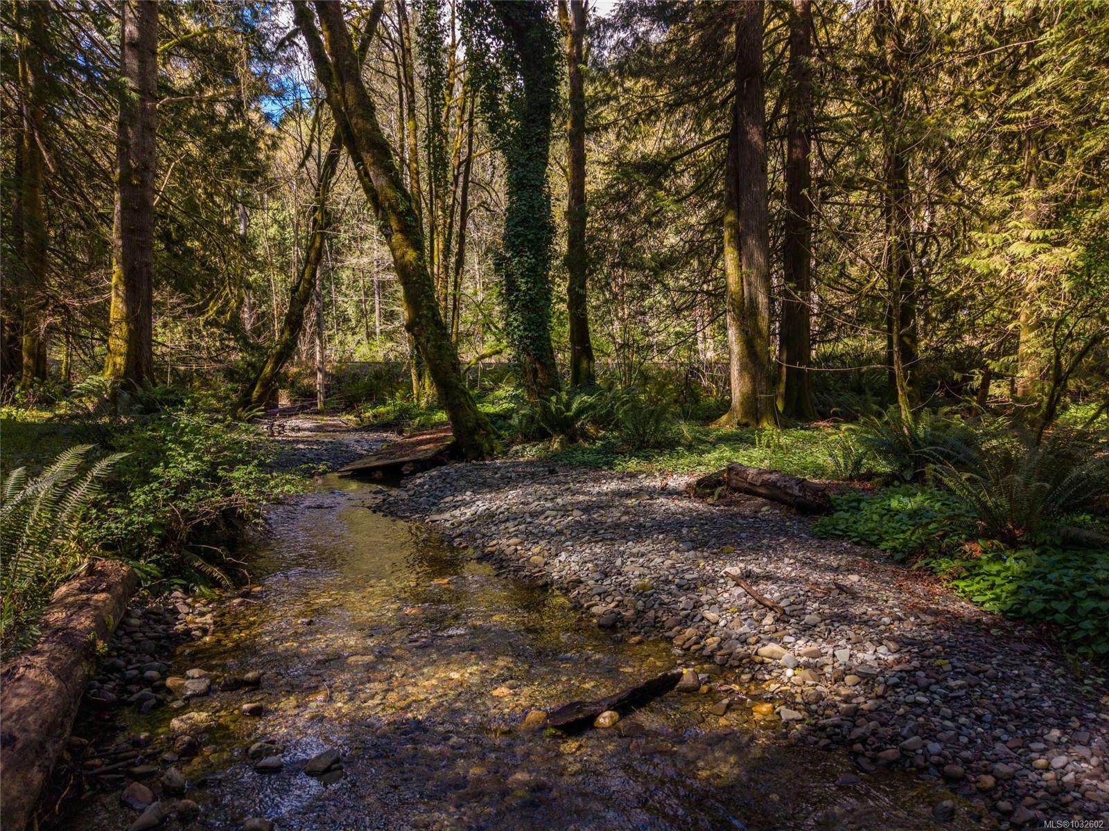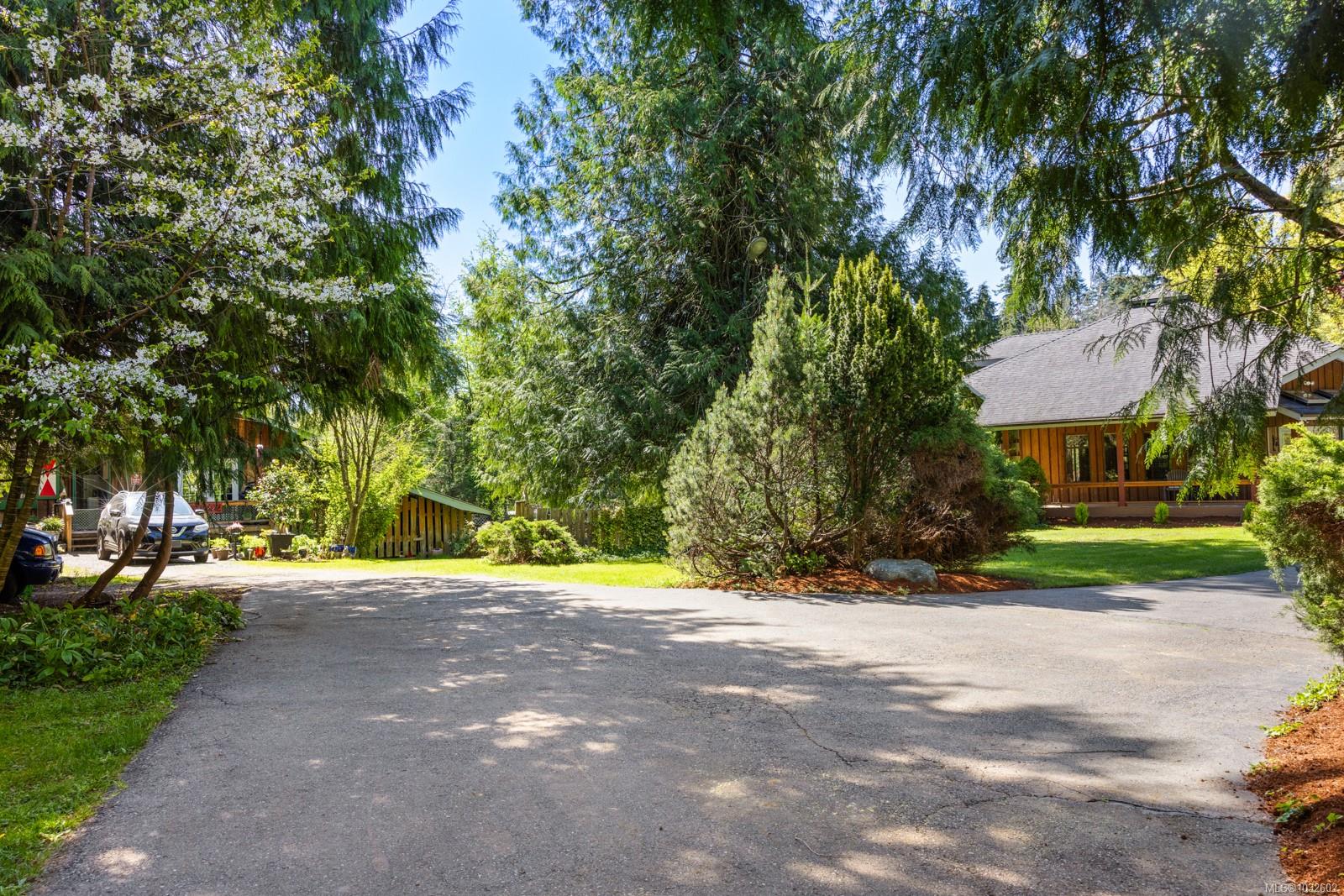 This rare, one-of-a-kind 4.8-acre property with a main home, detached 2 bed in-law cottage & a double garage is pure magic. Mature trees, established plantings & a salmon spawning creek with charming bridges set a whimsical stage against Mt Prevost. Peacefully private, yet minutes from town, this sun-drenched escape offers endless possibility. Inside the main home, find 2 main-floor bedrooms both with ensuites, a living room with a cozy wood stove, spacious dining area, inviting sunroom & an updated kitchen. Upstairs, the 1000sqft primary suite awaits with endless potential to create your sanctuary or reimagine the layout. Downstairs you will find the laundry, 3pc bath & unfinished space offering future opportunity or workshop/storage. The 2-bed, 2-bath cottage is perfect for guests or family & the attached lean-to is perfect for all your toys. This is a lifestyle canvas. Bask in the sun, create memories, & enjoy semi-rural tranquility with town at your fingertips. New water system.